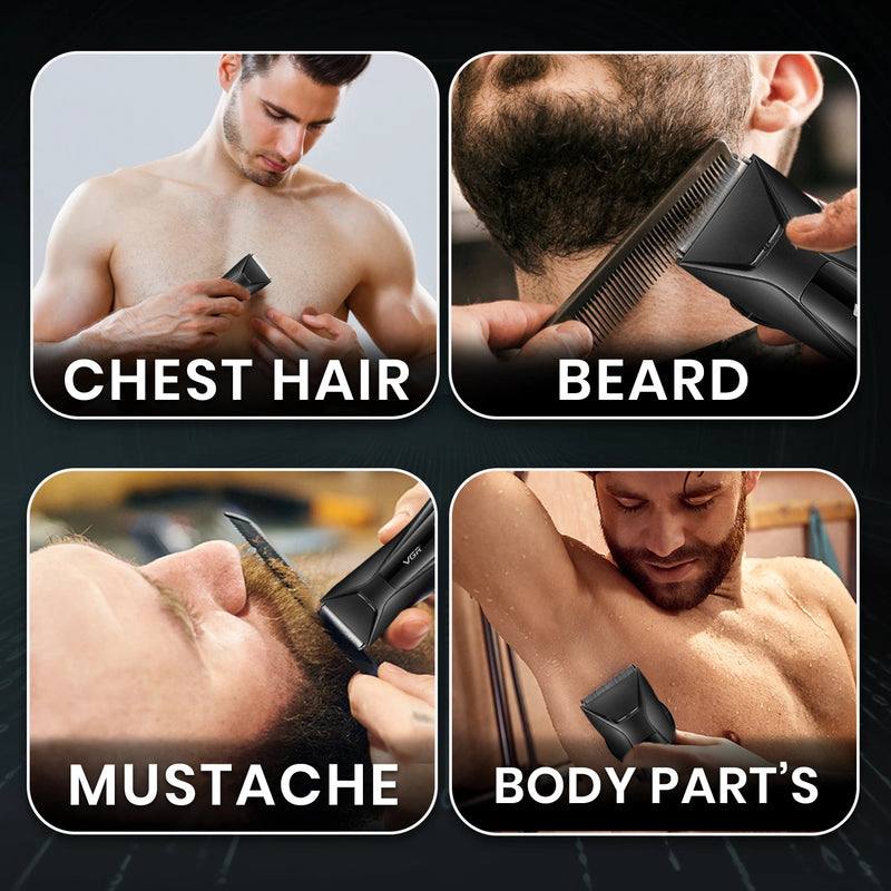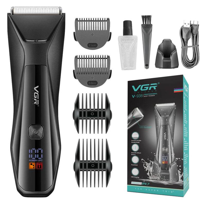 ماكينة حلاقة شعر الجسم VGR V-938 للرجال - ماكينة حلاقة شعر الكرات للرجال، ماكينة حلاقة شعر العانة مع 4 أمشاط تشذيب، ماكينة حلاقة شعر العانة المقاومة للماء مع قاعدة شحن لاسلكية وجهاز تشذيب الجسم مع كشاف LED وقفل للسفر