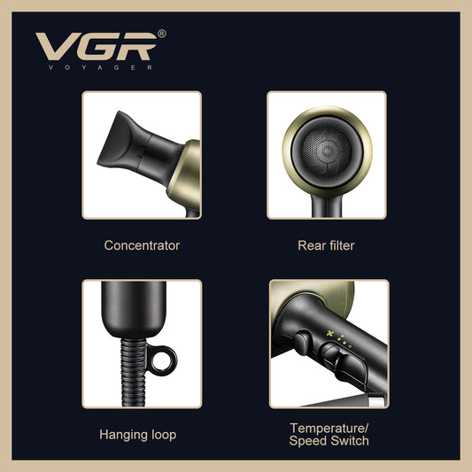 VGR V-450 Professional Salon Series Hair Dryer 2000-2400W AC Motor 3 Heat Setting Independent Cool Shot Styling Comb Nozzle Concentrator Overheating Protection with Turbo Function & 2 Speed Setting