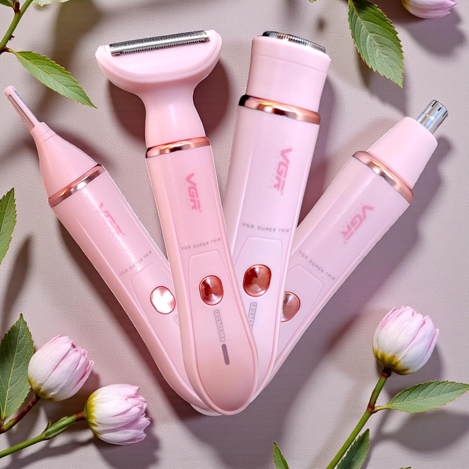 VGR V-761 Professional 4-in-1 Electric Lady Shaver Set, Pink, Waterproof Rechargeable Trimmer with Interchangeable Heads for Face, Body, Nose, Eyebrow Grooming, USB Charging.